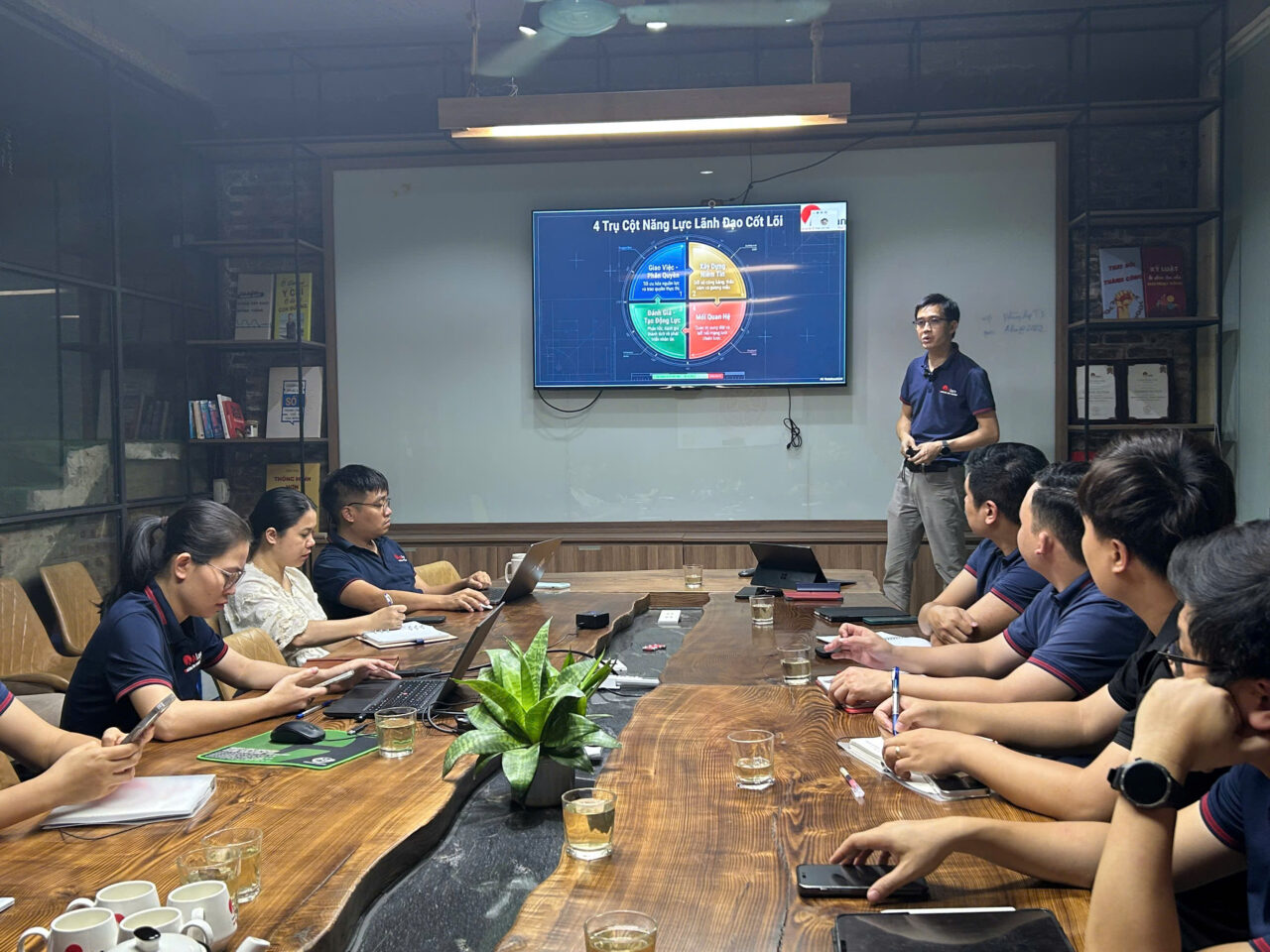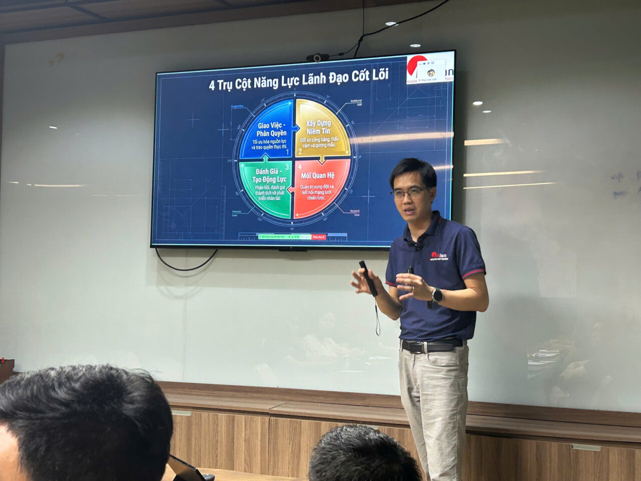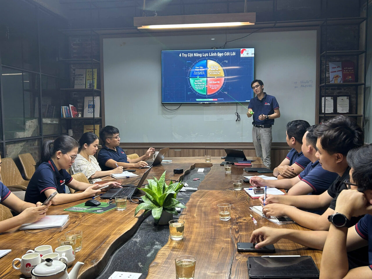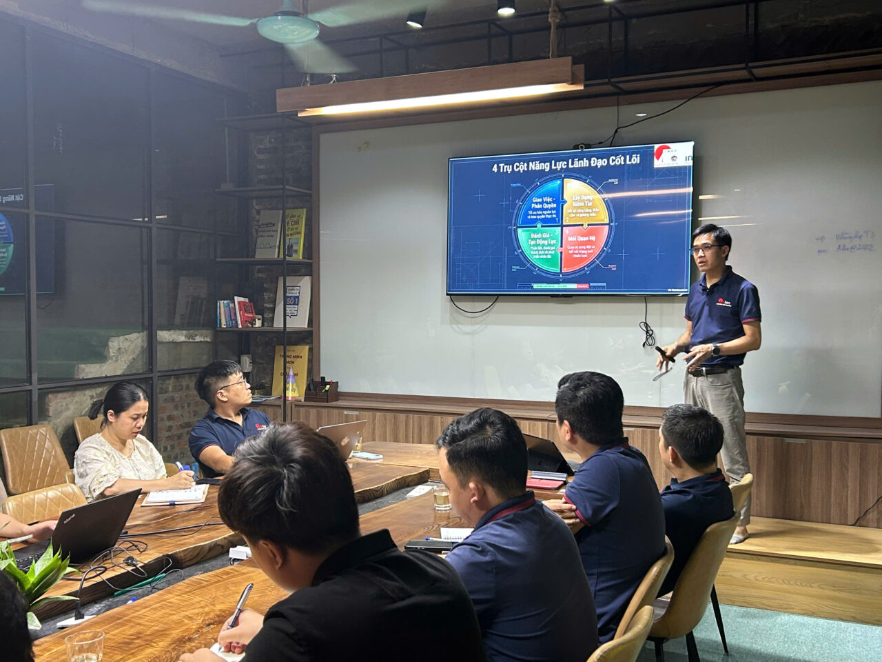 Không gian đào tạo được tổ chức trong môi trường chuyên nghiệp, hiện đại, tạo điều kiện tối đa cho sự tương tác và chia sẻ. Các quản lý tham gia không chỉ tiếp nhận kiến thức mà còn cùng nhau phân tích tình huống, phản biện và đúc kết kinh nghiệm thực tiễn. Chính sự cộng hưởng này đã nâng tầm chương trình, biến mỗi buổi đào tạo trở thành một diễn đàn trí tuệ, nơi tư duy lãnh đạo được mài giũa và phát triển.