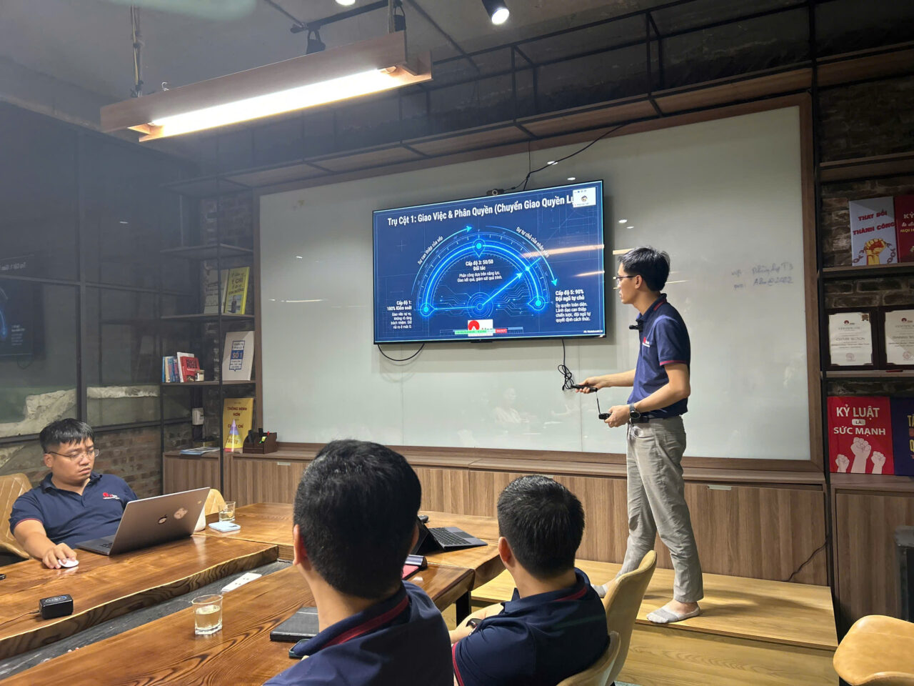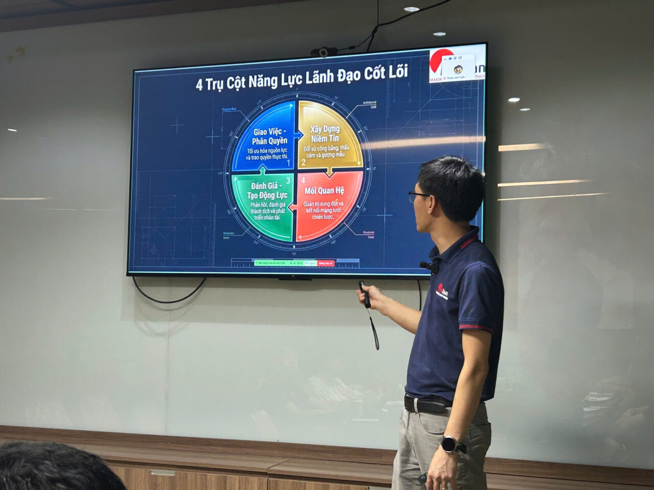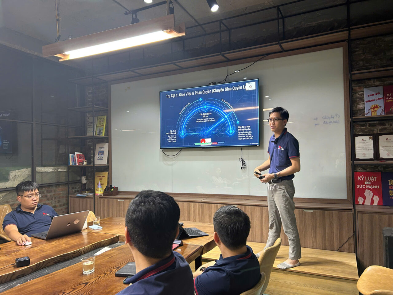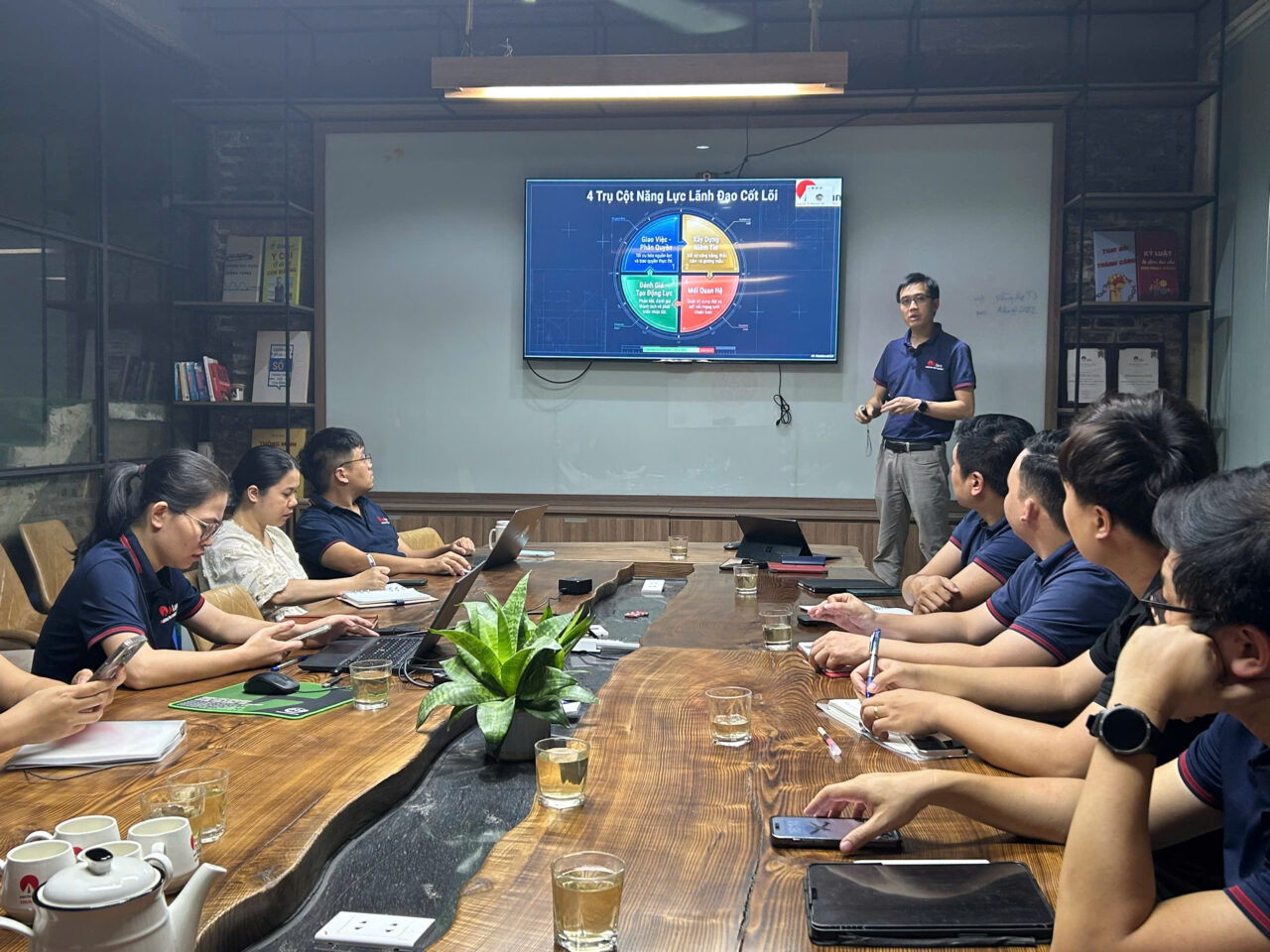 Không gian đào tạo được tổ chức trong môi trường chuyên nghiệp, hiện đại, tạo điều kiện tối đa cho sự tương tác và chia sẻ. Các quản lý tham gia không chỉ tiếp nhận kiến thức mà còn cùng nhau phân tích tình huống, phản biện và đúc kết kinh nghiệm thực tiễn. Chính sự cộng hưởng này đã nâng tầm chương trình, biến mỗi buổi đào tạo trở thành một diễn đàn trí tuệ, nơi tư duy lãnh đạo được mài giũa và phát triển.